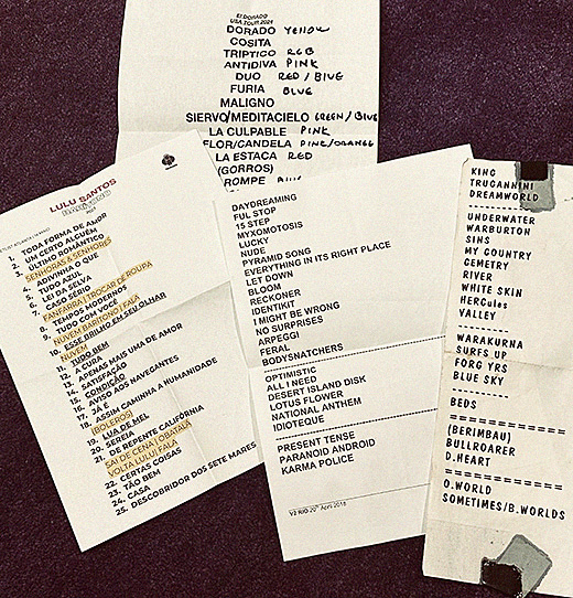 É preciso avisar o Pedro “Blackhill” que a Sociedade dos Tarados por Setlists ™️ está espalhada pelo mundo e muito ativa.Aqui algumas das muitas pepitas do meu arquivo, coletadas ao longo dos últimos 30 anos. O da direita é do show do Midnight Oil em SP em 1997, que ganhei das mãos do Peter Garrett. Ao meio, o setlist perfeito do show do Radiohead no RJ em 2018, naquela casa de shows que muda de nome toda hora, perto do Parque Olímpico.
